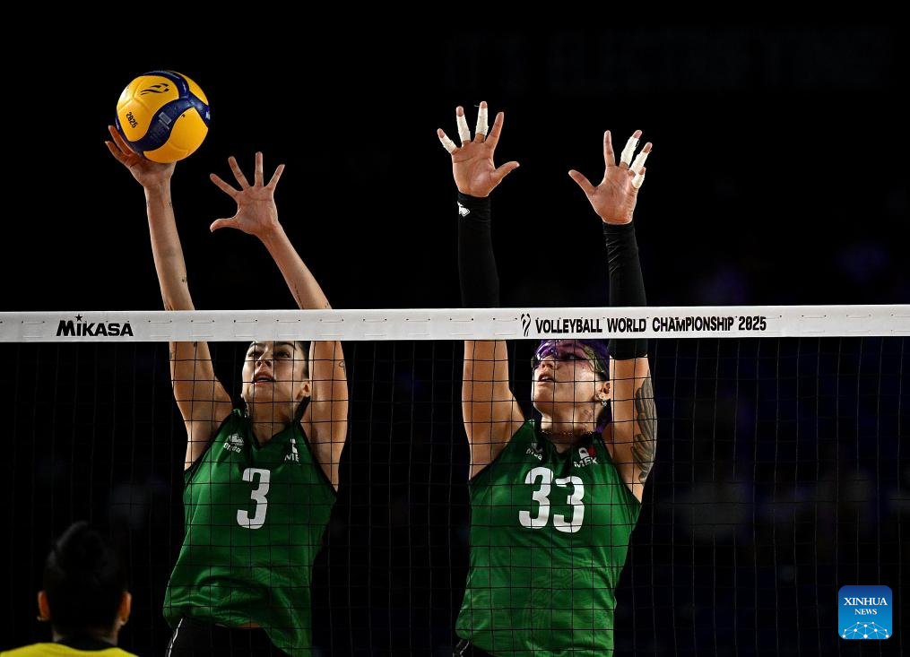 CHIANG MAI, 25 agosto, 2025 (Xinhua) -- Sofía Maldonado Díaz (i), y Karina Angélica Flores Gámez, de México, bloquean el balón durante el partido del grupo F de la fase preliminar entre República Dominicana y México, en el Campeonato Mundial de Voleibol Femenino, en Chiang Mai, Tailandia, el 25 de agosto de 2025. (Xinhua/Hou Zhaokang)