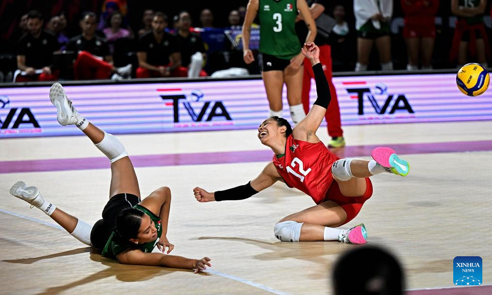 CHIANG MAI, 25 agosto, 2025 (Xinhua) -- Joseline Landeros Palacios (d), de México falla al salvar el balón durante el partido del grupo F de la fase preliminar entre República Dominicana y México, en el Campeonato Mundial de Voleibol Femenino, en Chiang Mai, Tailandia, el 25 de agosto de 2025. (Xinhua/Hou Zhaokang)