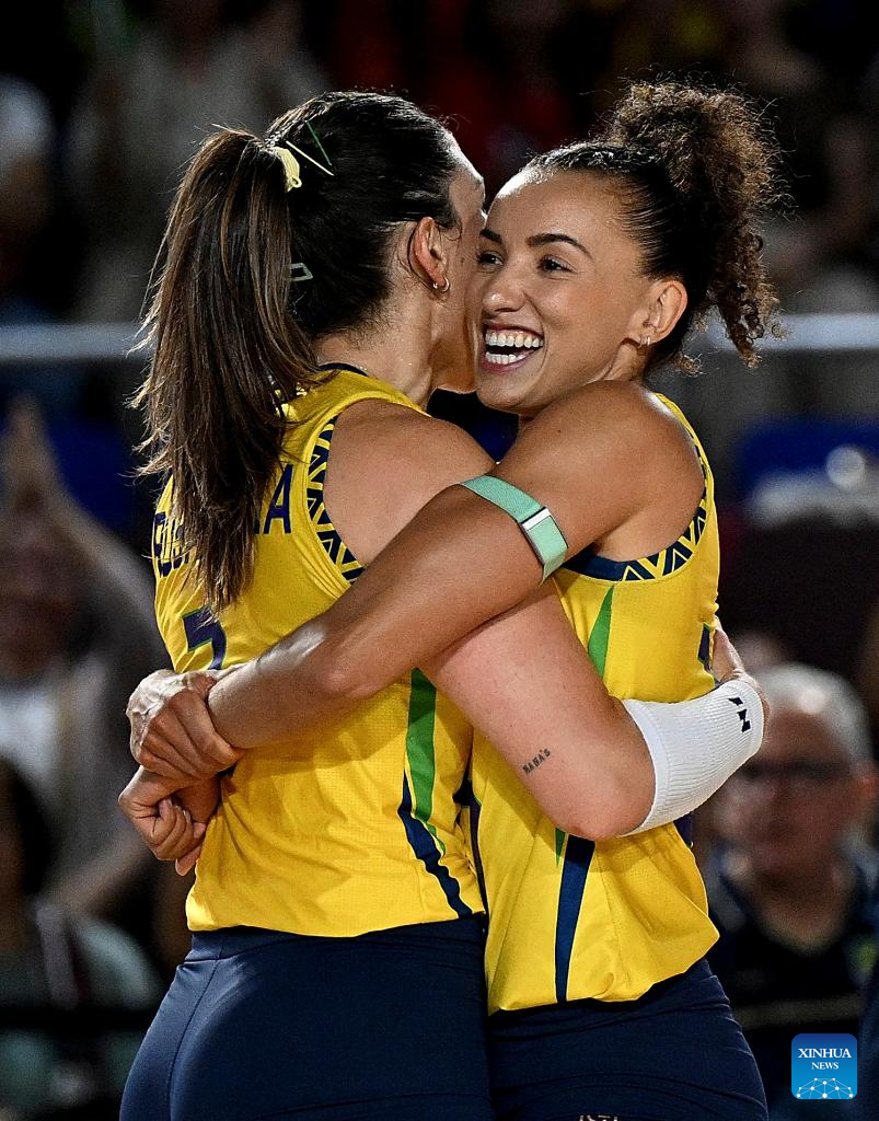 CHIANG MAI, 25 agosto, 2025 (Xinhua) -- Imagen del 24 de agosto de 2025 de Gabriela Braga Guimaraes (d), de Brasil, festejando un punto con su compañera Rosamaria Montibeller durante el partido del grupo C de la fase preliminar entre Brasil y Francia, en el Campeonato Mundial de Voleibol Femenino, en Chiang Mai, Tailandia. (Xinhua/Hou Zhaokang)