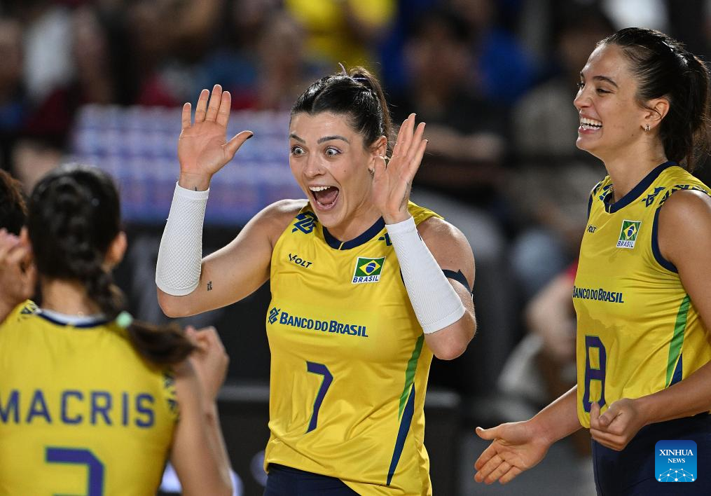 CHIANG MAI, 25 agosto, 2025 (Xinhua) -- Imagen del 24 de agosto de 2025 de Julia Gambatto Kudiess (c), de Brasil, compitiendo durante el partido del grupo C de la fase preliminar entre Brasil y Francia, en el Campeonato Mundial de Voleibol Femenino, en Chiang Mai, Tailandia. (Xinhua/Sun Weitong)