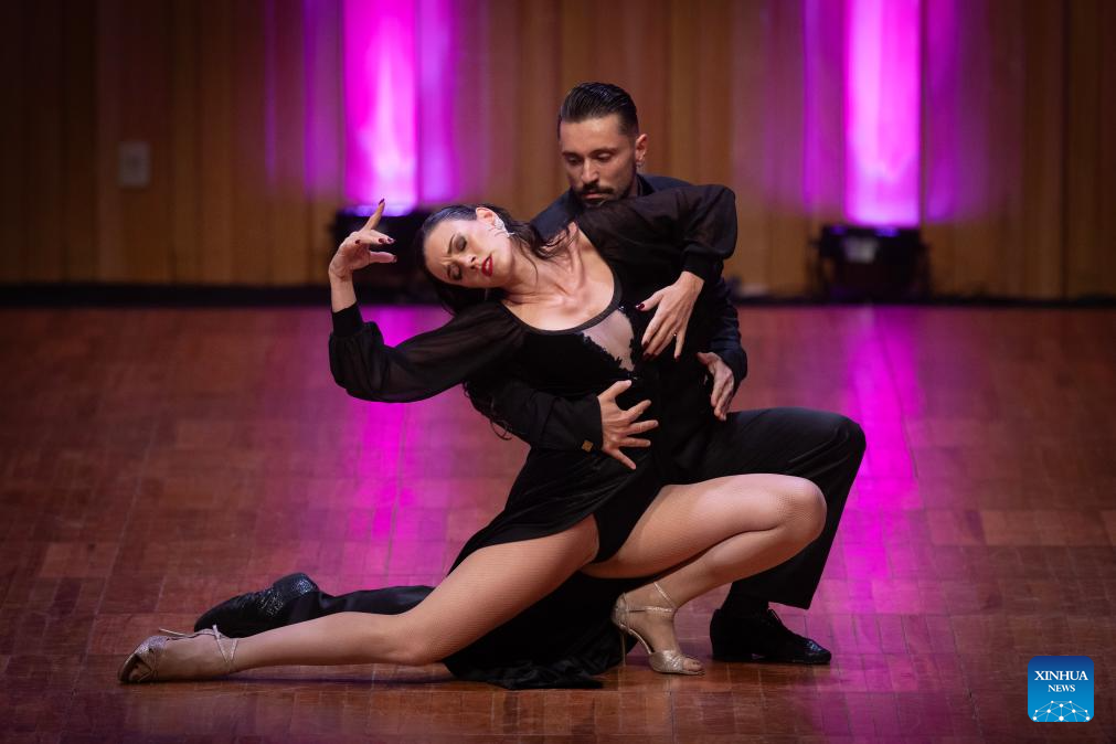 BUENOS AIRES, 25 agosto, 2025 (Xinhua) -- La pareja de concursantes conformada por Emmanouil Chronakis (d), y Konstantina Danai Zouni (i), participa en la ronda clasificatoria de la categoría "Tango Escenario" durante el Campeonato Mundial de Tango de Buenos Aires, en la Usina del Arte, en la ciudad de Buenos Aires, capital de Argentina, el 25 de agosto de 2025. (Xinhua/Martín Zabala)