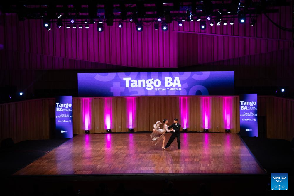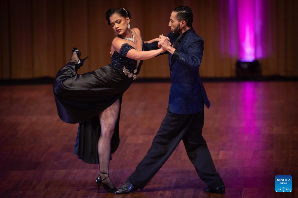 BUENOS AIRES, 25 agosto, 2025 (Xinhua) -- La pareja de concursantes conformada por Yoshi Shinji (d), y Guadalupe Rodino (i), participa en la ronda clasificatoria de la categoría "Tango Escenario" durante el Campeonato Mundial de Tango de Buenos Aires, en la Usina del Arte, en la ciudad de Buenos Aires, capital de Argentina, el 25 de agosto de 2025. (Xinhua/Martín Zabala)