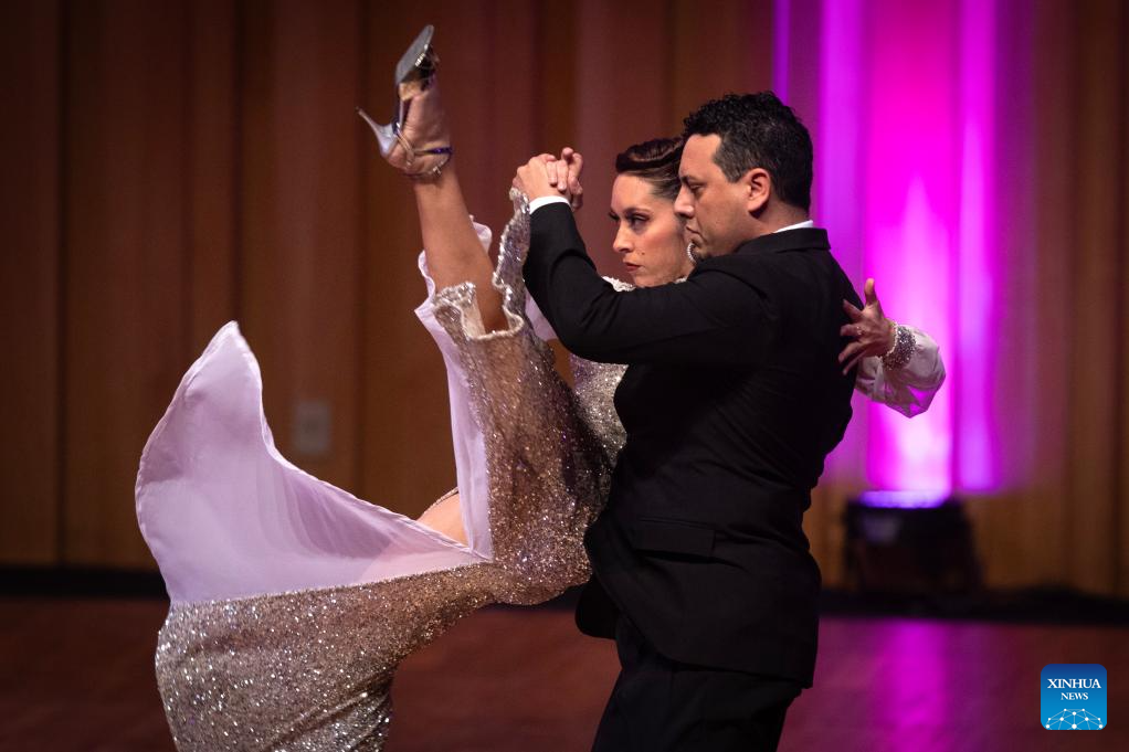 BUENOS AIRES, 25 agosto, 2025 (Xinhua) -- La pareja de concursantes conformada por Andrés González Ballesteros (d), y Sara Gómez Quiróz (i), participa en la ronda clasificatoria de la categoría "Tango Escenario" durante el Campeonato Mundial de Tango de Buenos Aires, en la Usina del Arte, en la ciudad de Buenos Aires, capital de Argentina, el 25 de agosto de 2025. (Xinhua/Martín Zabala)