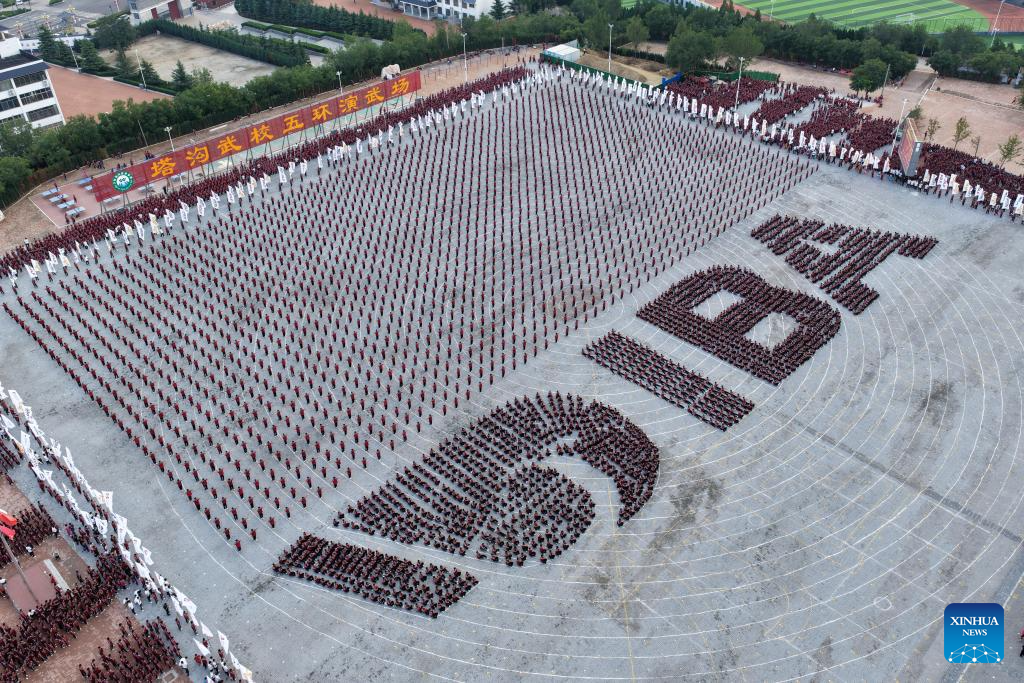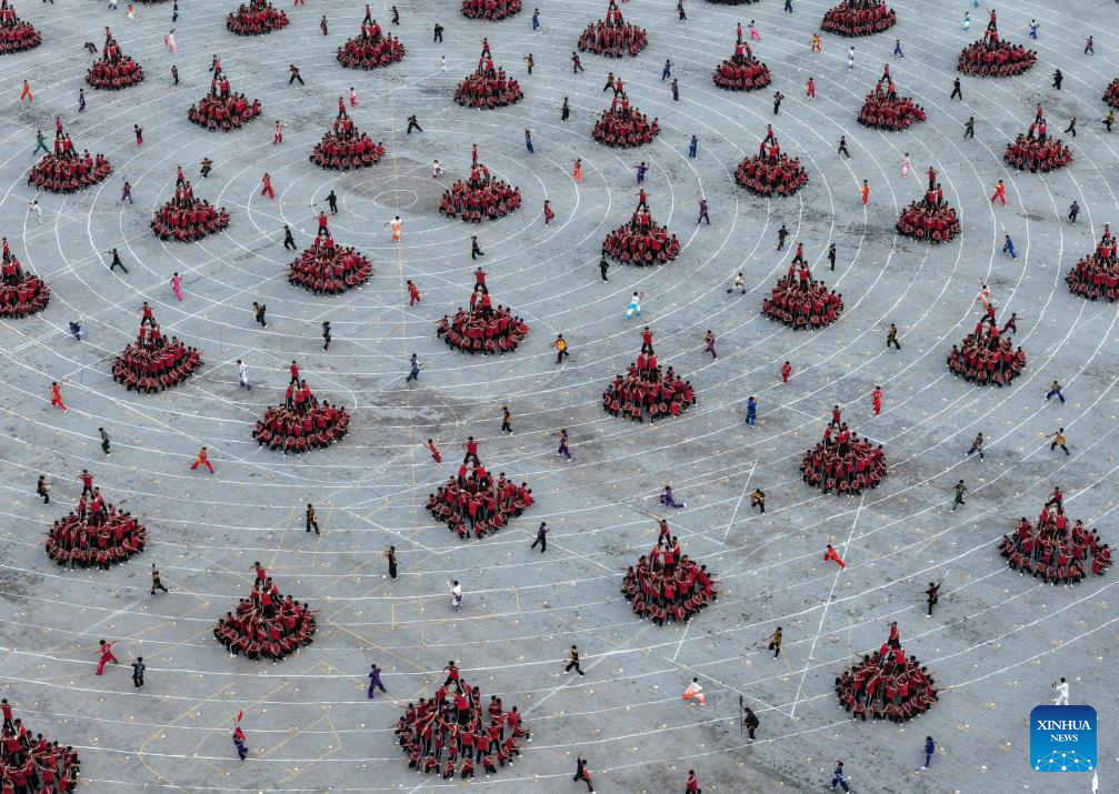 ZHENGZHOU, 27 agosto, 2025 (Xinhua) -- Imagen tomada con un dron el 27 de agosto de 2025 de la presentación de estudiantes de la Escuela de Artes Marciales Shaolin Tagou durante la celebración del Día Internacional del Boxeo organizada por la Asociación Internacional de Boxeo, en Dengfeng, en Zhengzhou, en la provincia de Henan, en el centro de China. (Xinhua/Li Jianan)