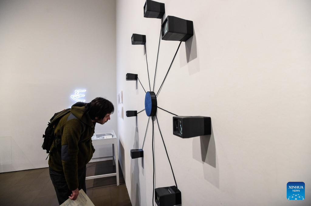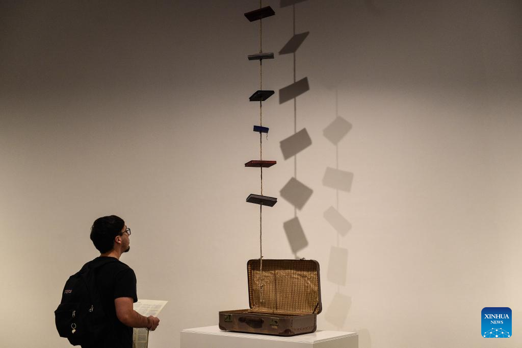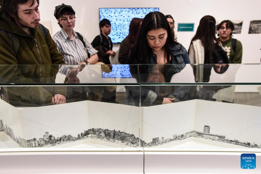 SANTIAGO, 28 agosto, 2025 (Xinhua) -- Imagen del 26 de agosto de 2025 de una persona observando una obra en la muestra chilena "Ida y Vuelta", en el Centro de Extensión de la Pontificia Universidad Católica de Chile, en Santiago, capital de Chile. Numerosos viajes convertidos en poemas, bitácoras, fotografías y otras expresiones artísticas son exploradas en la muestra chilena "Ida y Vuelta", en el marco del 7° Festival de Libros, que se lleva a cabo en la capital Santiago hasta el 30 de septiembre próximo. (Xinhua/Jorge Villegas)