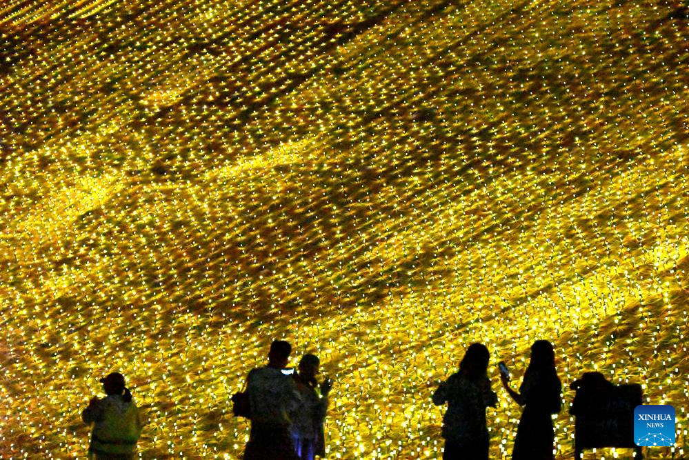 DUNHUANG, 29 agosto, 2025 (Xinhua) -- Imagen del 28 de agosto de 2025 de turistas visitando la Montaña Mingsha iluminada con luces alimentadas por energía solar, en la ciudad de Dunhuang, en la provincia de Gansu, en el noroeste de China. Un total de 40.000 luces alimentadas por energía solar instaladas en la Montaña Mingsha y el área escénica del Manantial de la Luna Creciente iluminaron un lado de la Montaña Mingsha el jueves, realzando el encanto del desierto en la noche. (Xinhua/Zhang Xiaoliang)