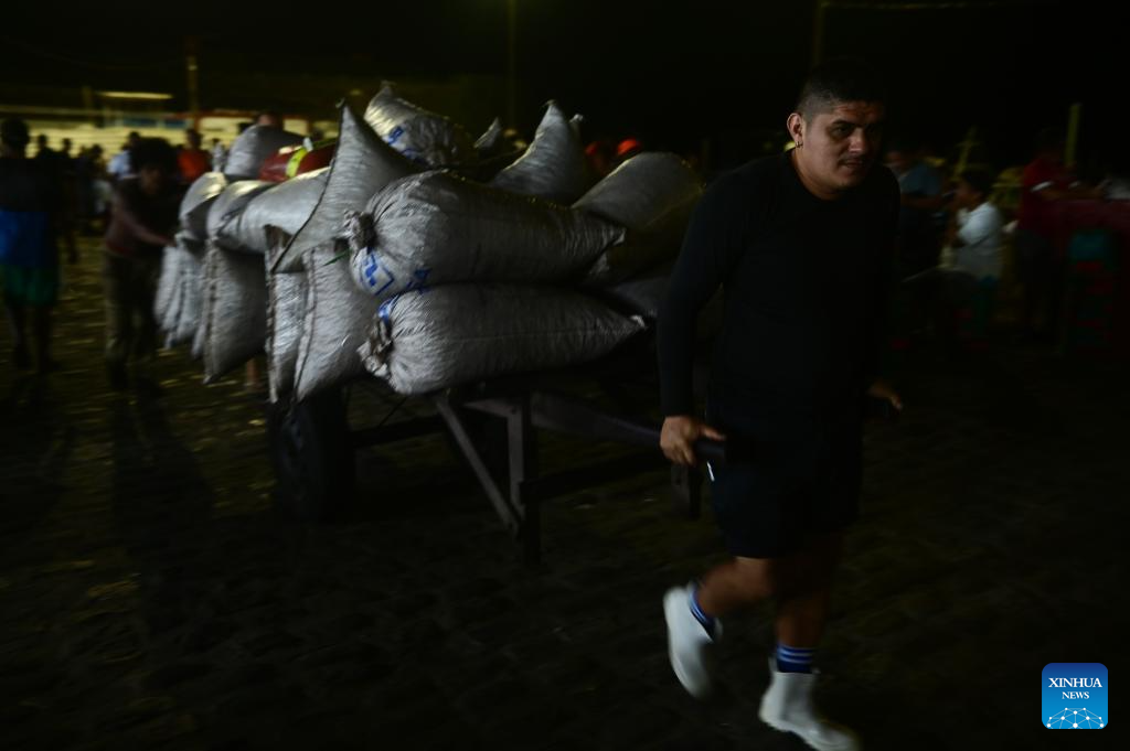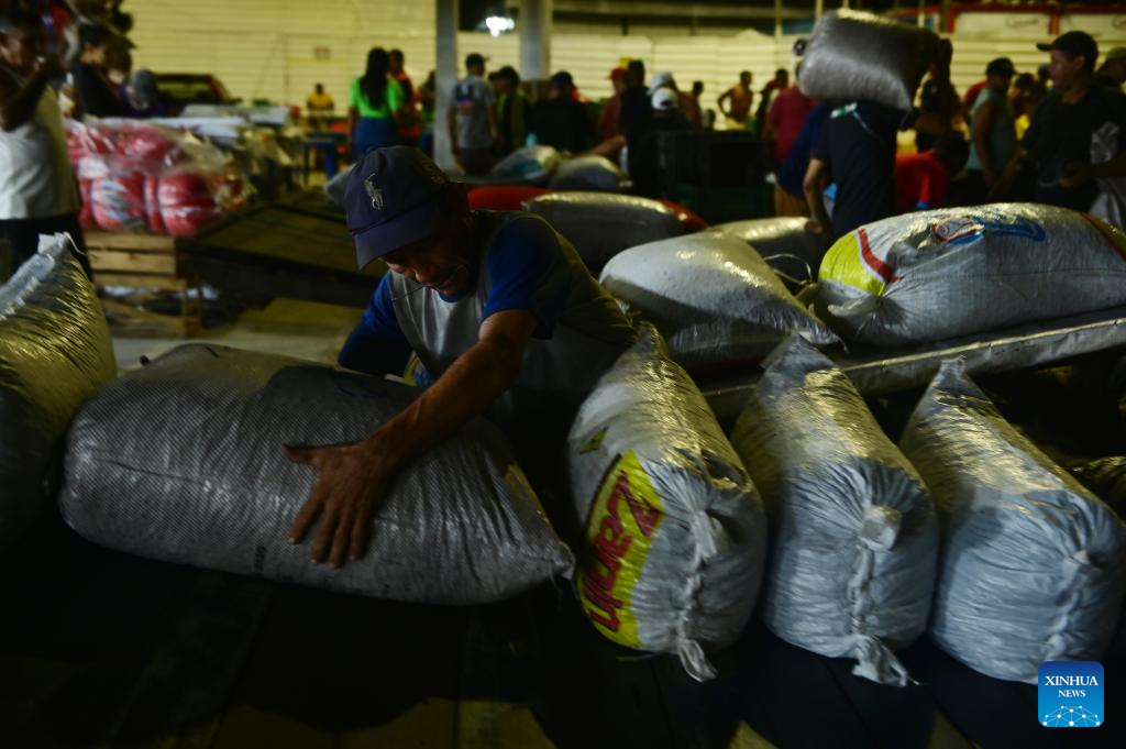 BELEM, 29 agosto, 2025 (Xinhua) -- Un hombre carga un costal de asaí en un mercado nocturno, en Belém, estado de Pará, Brasil, el 29 de agosto de 2025. (Xinhua/Lucio Tavora)