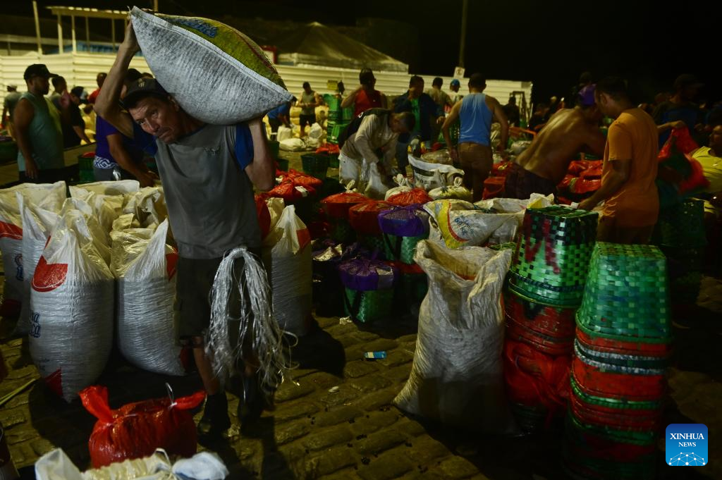 BELEM, 29 agosto, 2025 (Xinhua) -- Un hombre transporta costales de asaí en un mercado nocturno, en Belém, estado de Pará, Brasil, el 29 de agosto de 2025. (Xinhua/Lucio Tavora)