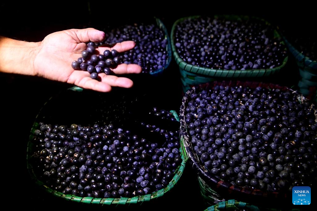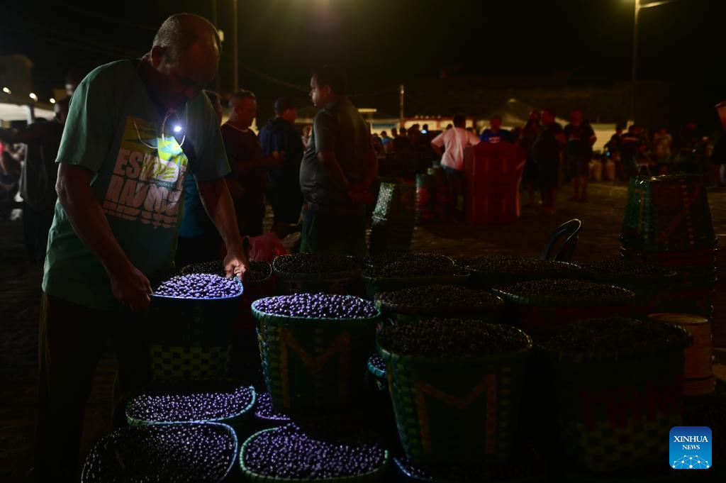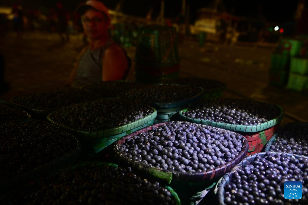 BELEM, 29 agosto, 2025 (Xinhua) -- Un hombre examina bayas de asaí en un mercado nocturno, en Belém, estado de Pará, Brasil, el 29 de agosto de 2025. (Xinhua/Lucio Tavora)