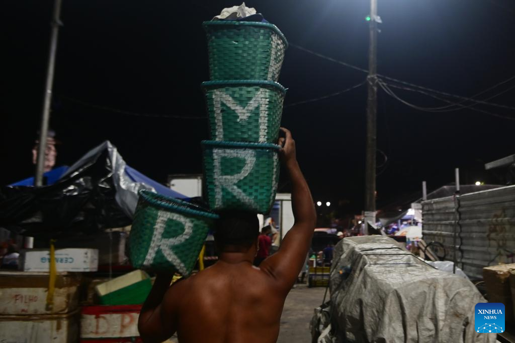 BELEM, 29 agosto, 2025 (Xinhua) -- Un hombre carga cajas de asaí en un mercado nocturno, en Belém, estado de Pará, Brasil, el 29 de agosto de 2025. (Xinhua/Lucio Tavora)