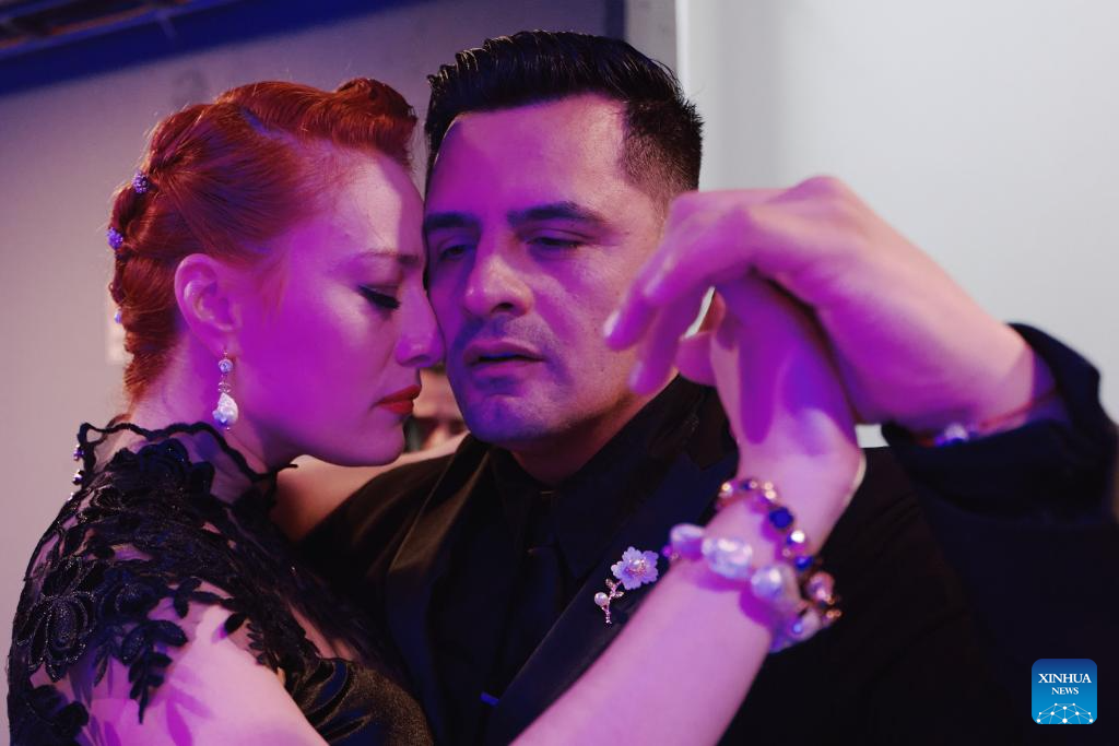 BUENOS AIRES, 30 agosto, 2025 (Xinhua) -- Imagen del 29 de agosto de 2025 de bailarines calentando durante la semifinal del Festival y Campeonato Mundial de Tango de Buenos Aires 2025, en Buenos Aires, Argentina. (Xinhua/Meng Dingbo)