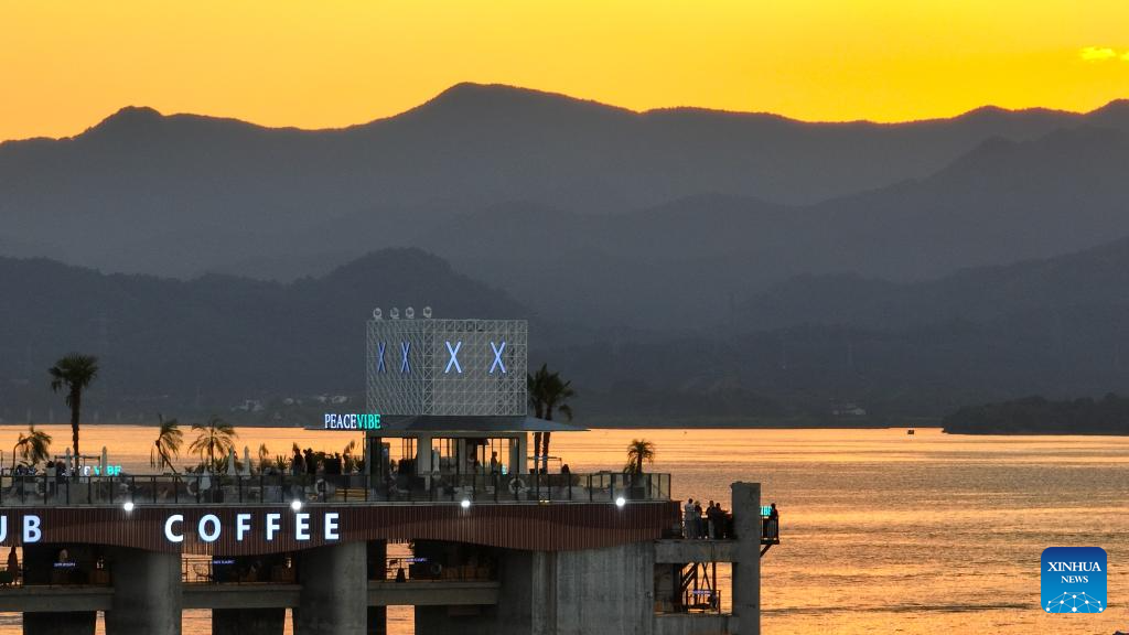 HEFEI, 30 agosto, 2025 (Xinhua) -- Imagen tomada con un dron el 28 de agosto de 2025 de visitantes disfrutando del atardecer en un centro de deportes acuáticos, en la ciudad de Huangshan, en la provincia de Anhui, en el este de China. Durante las vacaciones de verano, las ciudades de la provincia de Anhui han aprovechado sus abundantes recursos montañosos e hídricos para desarrollar una "economía de refrescamiento", atrayendo a un gran número de visitantes. (Xinhua/Zhou Mu)