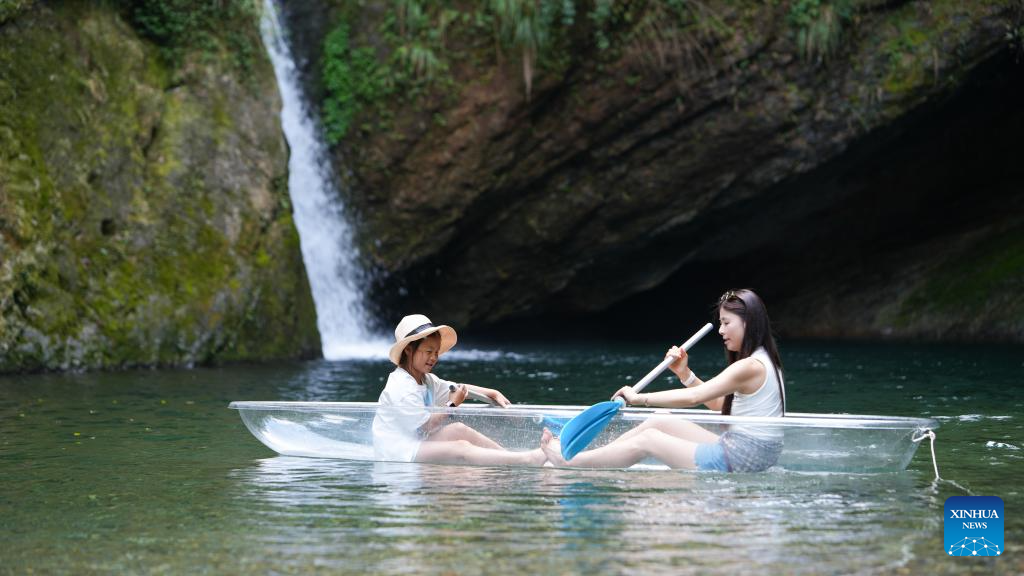 HEFEI, 30 agosto, 2025 (Xinhua) -- Imagen del 26 de agosto de 2025 de visitantes disfrutando de actividades acuáticas en un punto escénico, en el distrito de Yixian, en la ciudad de Huangshan, en la provincia de Anhui, en el este de China. Durante las vacaciones de verano, las ciudades de la provincia de Anhui han aprovechado sus abundantes recursos montañosos e hídricos para desarrollar una "economía de refrescamiento", atrayendo a un gran número de visitantes. (Xinhua/Wang Cheng) (oa) (dra)