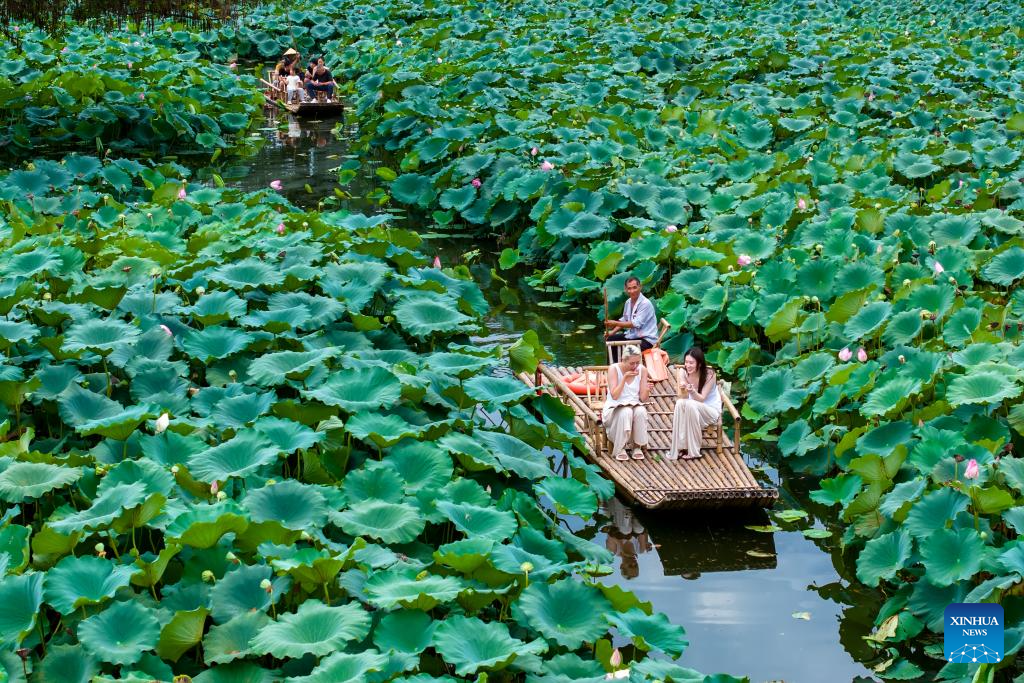HEFEI, 30 agosto, 2025 (Xinhua) -- Imagen tomada con un dron el 21 de agosto de 2025 de visitantes tomando una balsa de bambú, en la aldea de Chengkan, en la ciudad de Huangshan, en la provincia de Anhui, en el este de China. Durante las vacaciones de verano, las ciudades de la provincia de Anhui han aprovechado sus abundantes recursos montañosos e hídricos para desarrollar una "economía de refrescamiento", atrayendo a un gran número de visitantes. (Xinhua/Fan Chengzhu)