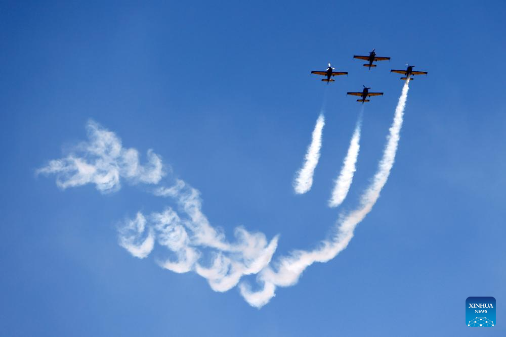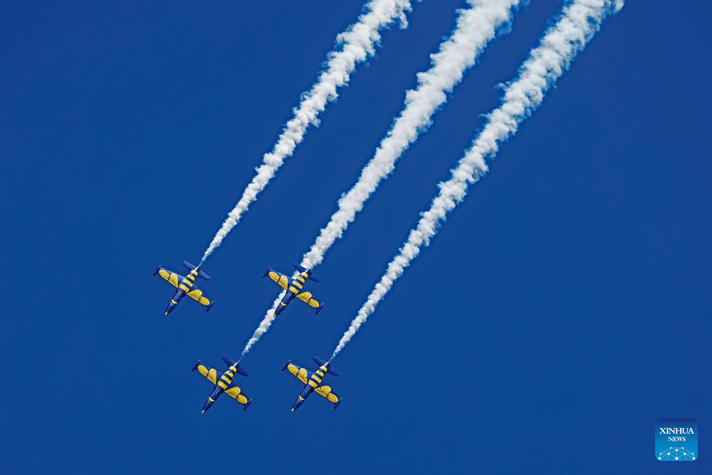 BUCAREST, 31 agosto, 2025 (Xinhua) -- Imagen del 30 de agosto de 2025 de pilotos del equipo acrobático Abejas Bálticas realizando realizando una presentación con aviones L-39C Albatros durante el Salón Aeronáutico Internacional de Bucarest 2025 (BIAS, por sus siglas en inglés), celebrado en el aeródromo de Baneasa, en Bucarest, Rumanía. Más de 100 aviones civiles y militares, así como más de 200 pilotos y paracaidistas, participan en la 15 edición del BIAS, el mayor salón aeronáutico de Rumanía. (Xinhua/Cristian Cristel)