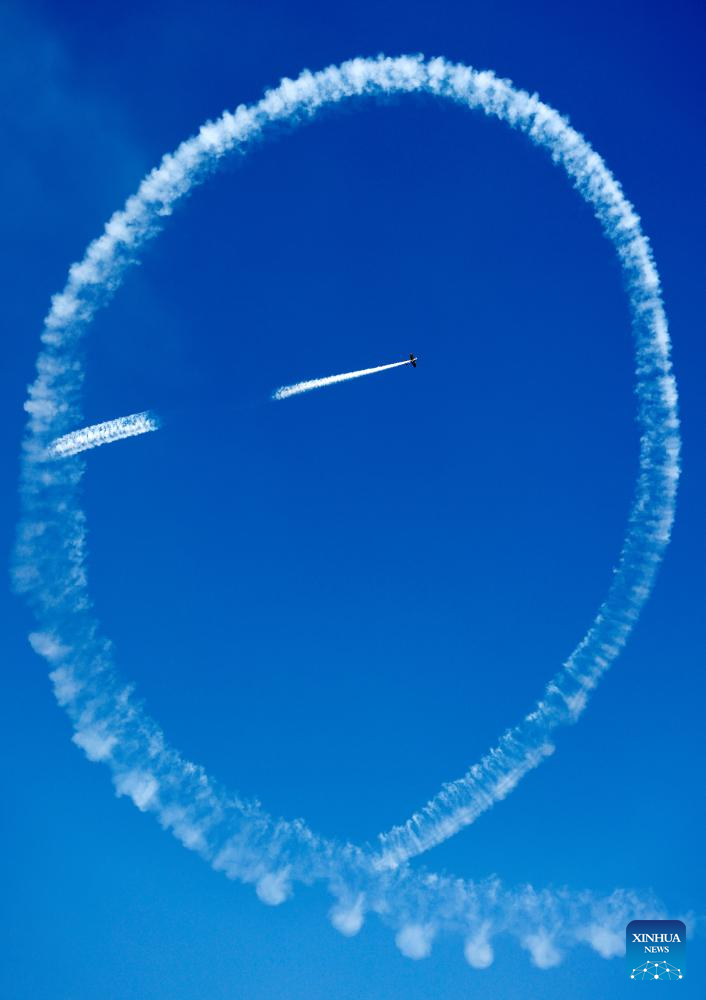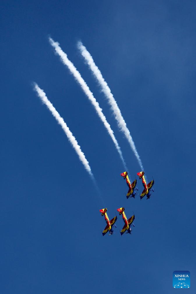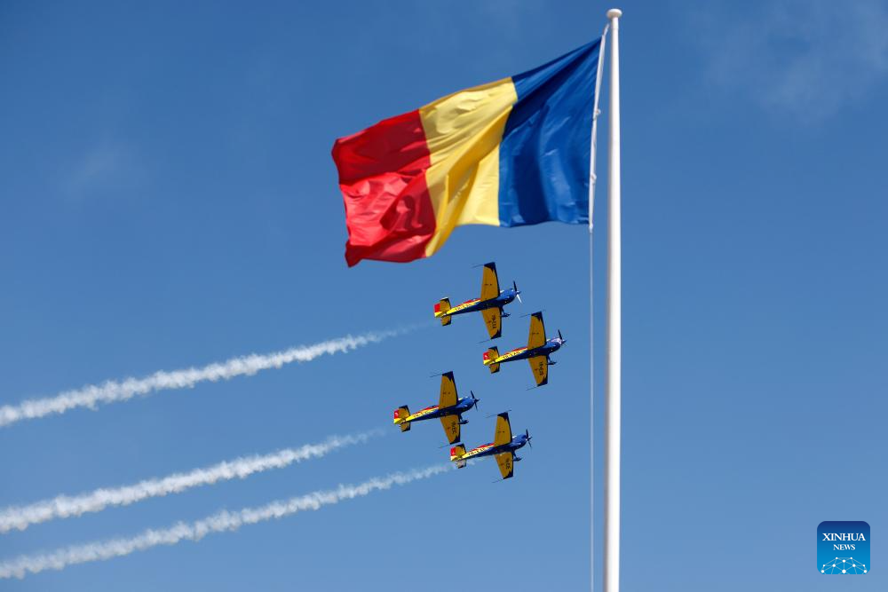 BUCAREST, 31 agosto, 2025 (Xinhua) -- Imagen del 30 de agosto de 2025 de miembros del equipo acrobático Halcones de Rumanía realizando una presentación con aviones Extra-330 durante el Salón Aeronáutico Internacional de Bucarest 2025 (BIAS, por sus siglas en inglés), celebrado en el aeródromo de Baneasa, en Bucarest, Rumanía. Más de 100 aviones civiles y militares, así como más de 200 pilotos y paracaidistas, participan en la 15 edición del BIAS, el mayor salón aeronáutico de Rumanía. (Xinhua/Cristian Cristel)