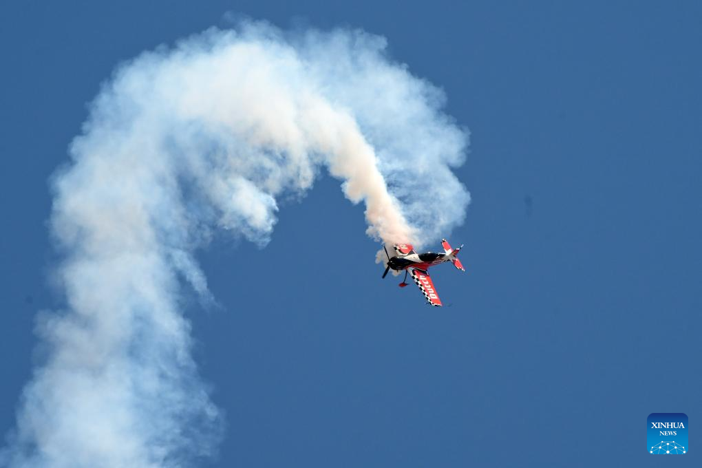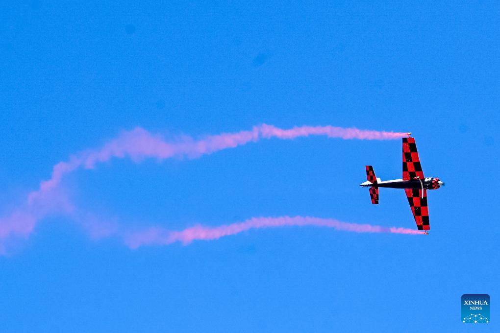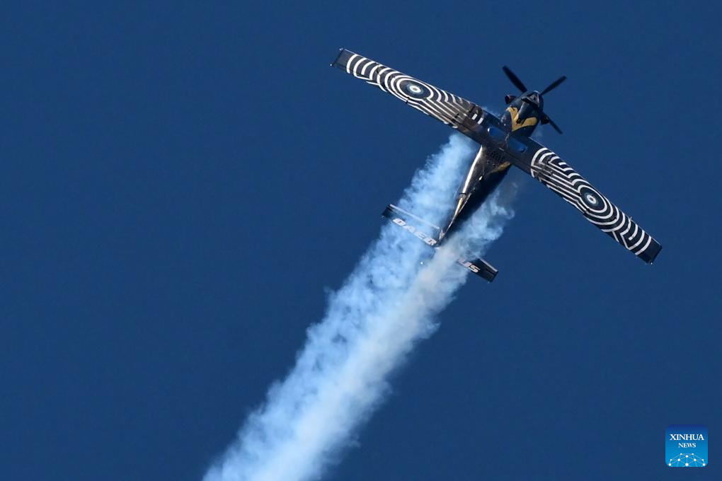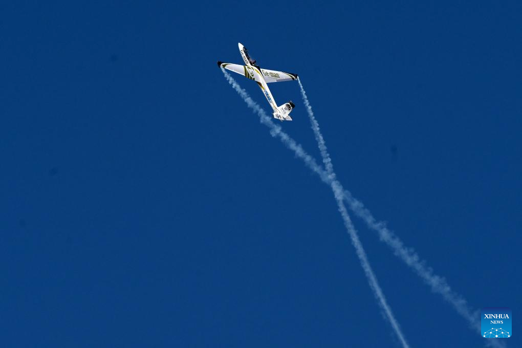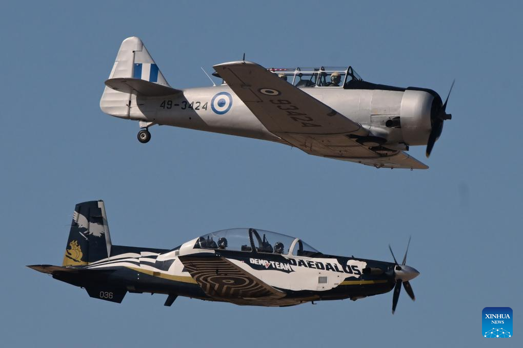 TANAGRA, 7 septiembre, 2025 (Xinhua) -- Imagen del 6 de septiembre de 2025 de un avión realizando una presentación durante un espectáculo aéreo en la base aérea de Tanagra, a unos 70 kilómetros al norte de Atenas, Grecia. La Semana Aeronáutica de Atenas 2025 comenzó aquí el sábado. (Xinhua/Marios Lolos)