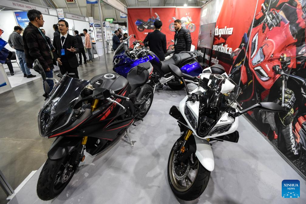 SANTIAGO, 8 septiembre, 2025 (Xinhua) -- Personas visitan el estand de una marca china de motocicletas durante la inauguración de la Expo Industrial Internacional Chile 2025, en Santiago, capital de Chile, el 8 de septiembre de 2025. (Xinhua/Jorge Villegas)