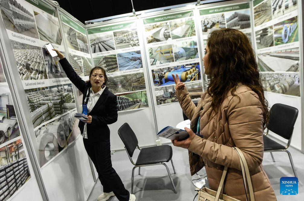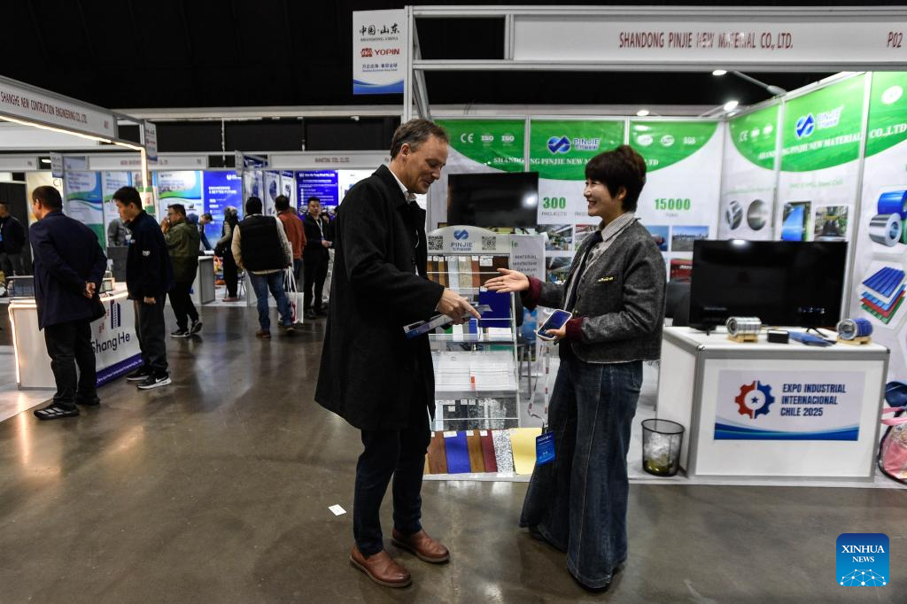 SANTIAGO, 8 septiembre, 2025 (Xinhua) -- Un visitante conversa con una expositora de una compañía china durante la inauguración de la Expo Industrial Internacional Chile 2025, en Santiago, capital de Chile, el 8 de septiembre de 2025. (Xinhua/Jorge Villegas)