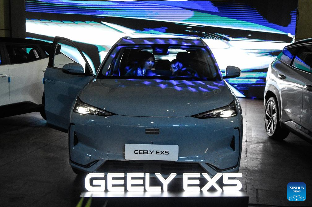 SANTIAGO, 8 septiembre, 2025 (Xinhua) -- Visitantes observan un automóvil de la marca china Geely durante la inauguración de la Expo Industrial Internacional Chile 2025, en Santiago, capital de Chile, el 8 de septiembre de 2025. (Xinhua/Jorge Villegas)