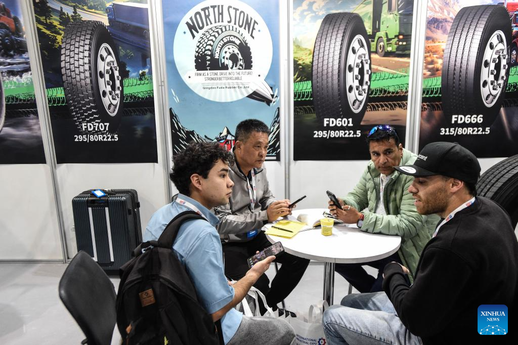 SANTIAGO, 8 septiembre, 2025 (Xinhua) -- Personas visitan el estand de una marca china de llantas durante la inauguración de la Expo Industrial Internacional Chile 2025, en Santiago, capital de Chile, el 8 de septiembre de 2025. (Xinhua/Jorge Villegas)