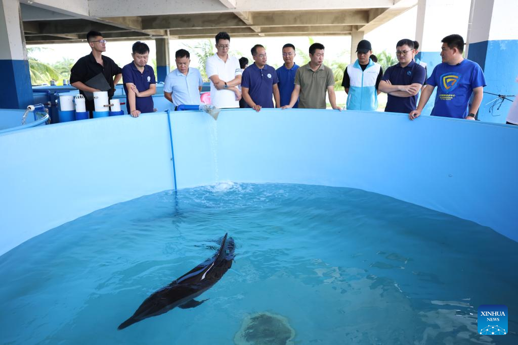 LINGSHUI, 8 septiembre, 2025 (Xinhua) -- Un equipo de expertos evalúa la condición del delfín "Wan Wan" en una instalación de rescate, en Lingshui, en la provincia de Hainan, en el sur de China, el 8 de septiembre de 2025. El delfín "Wan Wan", rescatado en Wanning, Hainan en junio, se ha recuperado bien después de casi tres meses de cuidados por un equipo de rescate. Se espera que el delfín sea liberado en el futuro cercano. (Xinhua/Zhang Liyun)