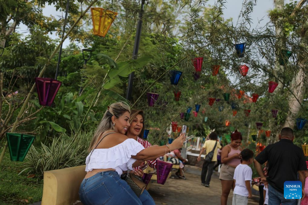 AHUACHAPAN, 8 septiembre, 2025 (Xinhua) -- Imagen del 7 de septiembre de 2025 de mujeres tomándose fotografías con un teléfono celular, en un parque adornado con faroles, durante la festividad del Día de los Farolitos, en el municipio de Concepción de Ataco, en el departamento de Ahuachapán, El Salvador. La noche cayó sobre la ciudad de Ahuachapán en el occidente de El Salvador y con ella una marea de luces coloridas transformó el domingo sus calles en un escenario vibrante con miles de farolitos de madera y papel de tonos brillantes que cubrieron balcones, aceras y plazas, al encender una de las tradiciones culturales más queridas del país. (Xinhua/Alexander Peña)