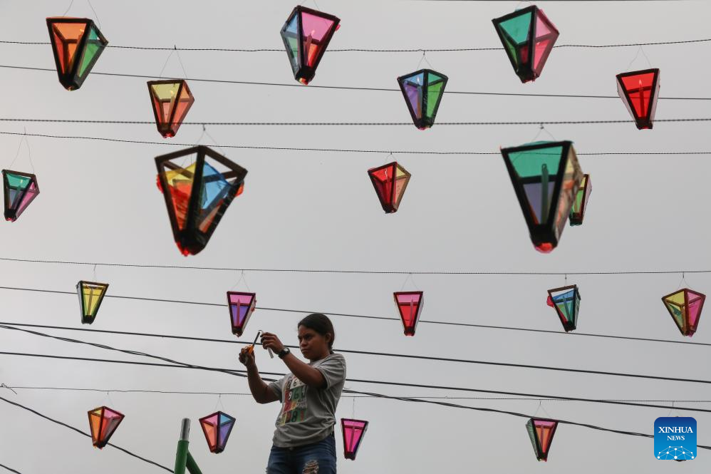 AHUACHAPAN, 8 septiembre, 2025 (Xinhua) -- Imagen del 7 de septiembre de 2025 de una mujer sosteniendo faroles en la estructura de una vivienda durante la festividad del Día de los Farolitos, en el municipio de Concepción de Ataco, en el departamento de Ahuachapán, El Salvador. La noche cayó sobre la ciudad de Ahuachapán en el occidente de El Salvador y con ella una marea de luces coloridas transformó el domingo sus calles en un escenario vibrante con miles de farolitos de madera y papel de tonos brillantes que cubrieron balcones, aceras y plazas, al encender una de las tradiciones culturales más queridas del país. (Xinhua/Alexander Peña)