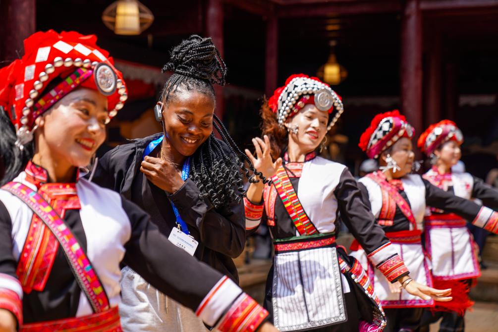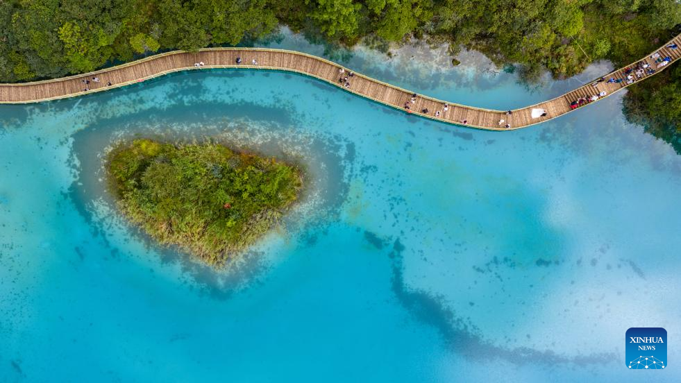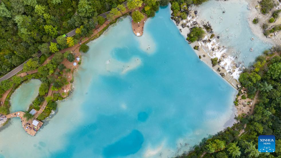 LIJIANG, 8 septiembre, 2025 (Xinhua) -- Vista aérea tomada con un dron el 8 de septiembre de 2025 de turistas visitando el valle de Lanyue (Luna Azul), en la ciudad de Lijiang, en la provincia de Yunnan, en el suroeste de China. (Xinhua/Hu Chao)