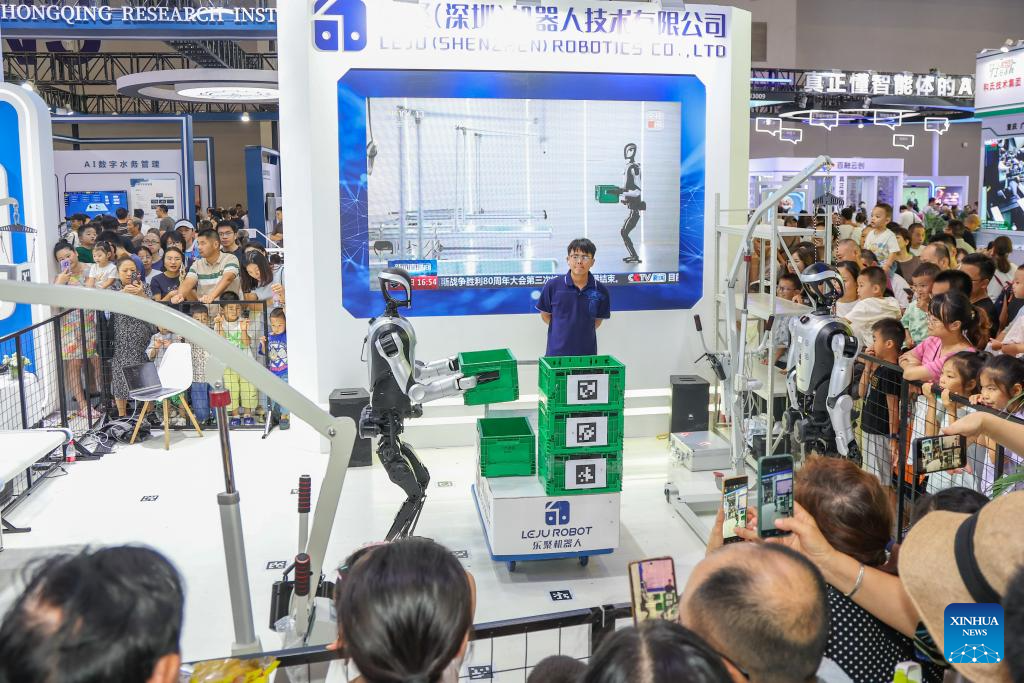 CHONGQING, 8 septiembre, 2025 (Xinhua) -- Imagen del 7 de septiembre de 2025 de visitantes observando trabajar a un robot humanoide, en la Exposición Mundial de la Industria Inteligente 2025, en la municipalidad de Chongqing, en el suroeste de China. La Exposición Mundial de la Industria Inteligente 2025 en curso, reúne a más de 600 empresas nacionales e internacionales para presentar tecnologías, productos y escenarios de aplicación en campos de vanguardia. (Xinhua/Huang Wei)