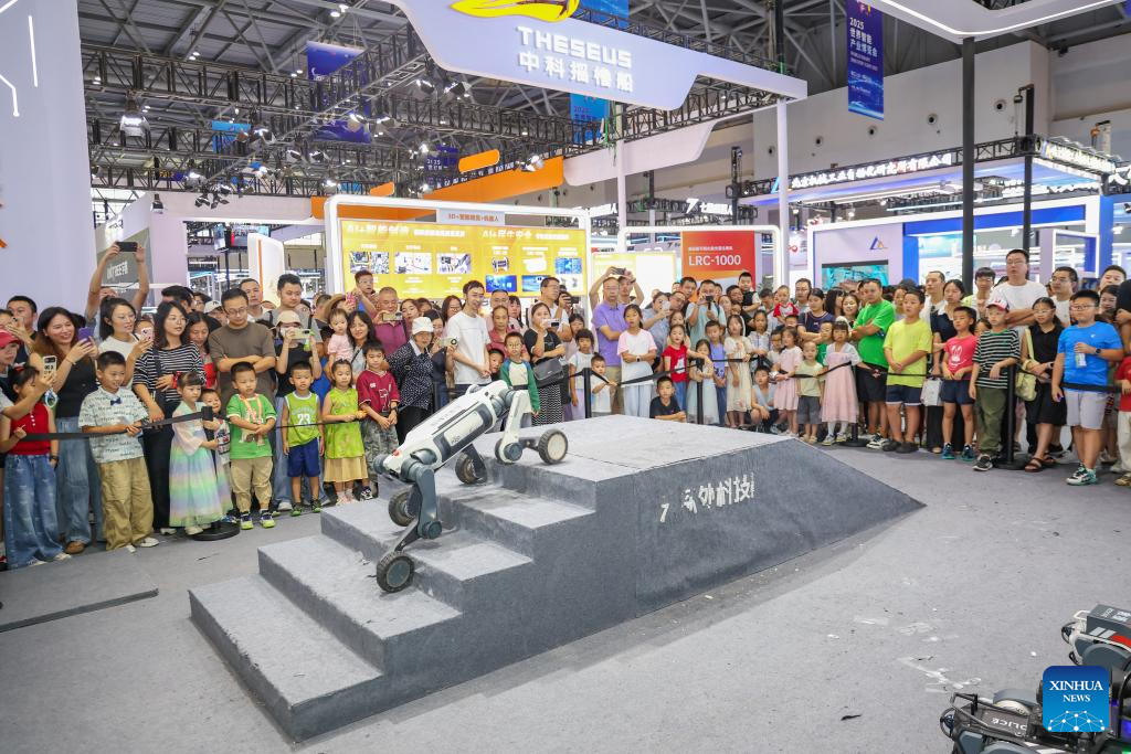 CHONGQING, 8 septiembre, 2025 (Xinhua) -- Imagen del 7 de septiembre de 2025 de visitantes observando la demostración de un perro robot en la Exposición Mundial de la Industria Inteligente 2025, en la municipalidad de Chongqing, en el suroeste de China. La Exposición Mundial de la Industria Inteligente 2025 en curso, reúne a más de 600 empresas nacionales e internacionales para presentar tecnologías, productos y escenarios de aplicación en campos de vanguardia. (Xinhua/Huang Wei)