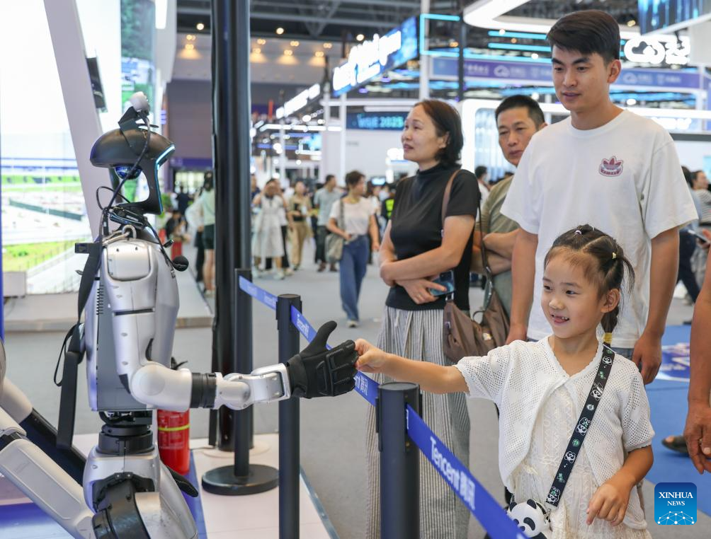 CHONGQING, 8 septiembre, 2025 (Xinhua) -- Un robot humanoide estrecha la mano de una niña en la Exposición Mundial de la Industria Inteligente 2025, en la municipalidad de Chongqing, en el suroeste de China, el 8 de septiembre de 2025. La Exposición Mundial de la Industria Inteligente 2025 en curso, reúne a más de 600 empresas nacionales e internacionales para presentar tecnologías, productos y escenarios de aplicación en campos de vanguardia. (Xinhua/Chen Cheng)