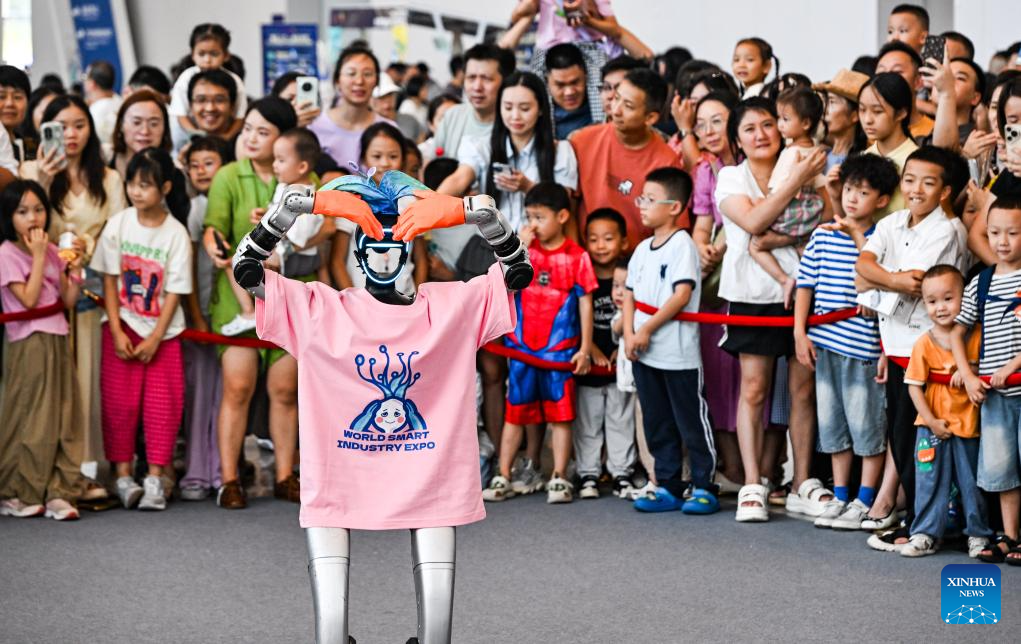 CHONGQING, 8 septiembre, 2025 (Xinhua) -- Imagen del 7 de septiembre de 2025 de un robot humanoide interactuando con visitantes en la Exposición Mundial de la Industria Inteligente 2025, en la municipalidad de Chongqing, en el suroeste de China. La Exposición Mundial de la Industria Inteligente 2025 en curso, reúne a más de 600 empresas nacionales e internacionales para presentar tecnologías, productos y escenarios de aplicación en campos de vanguardia. (Xinhua/Wang Quancgao)
