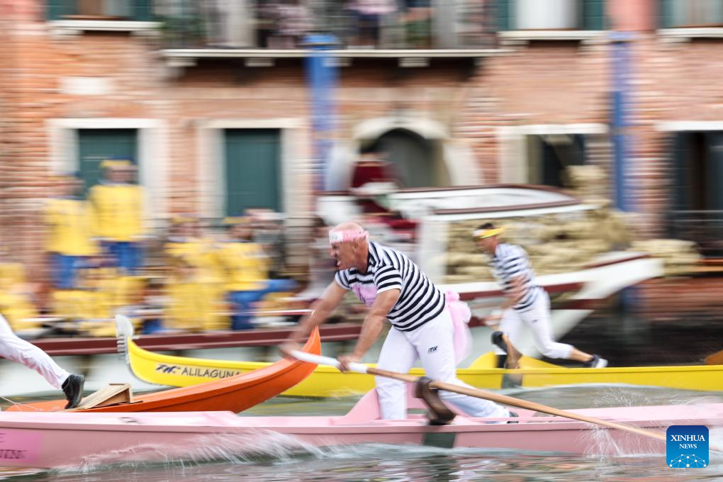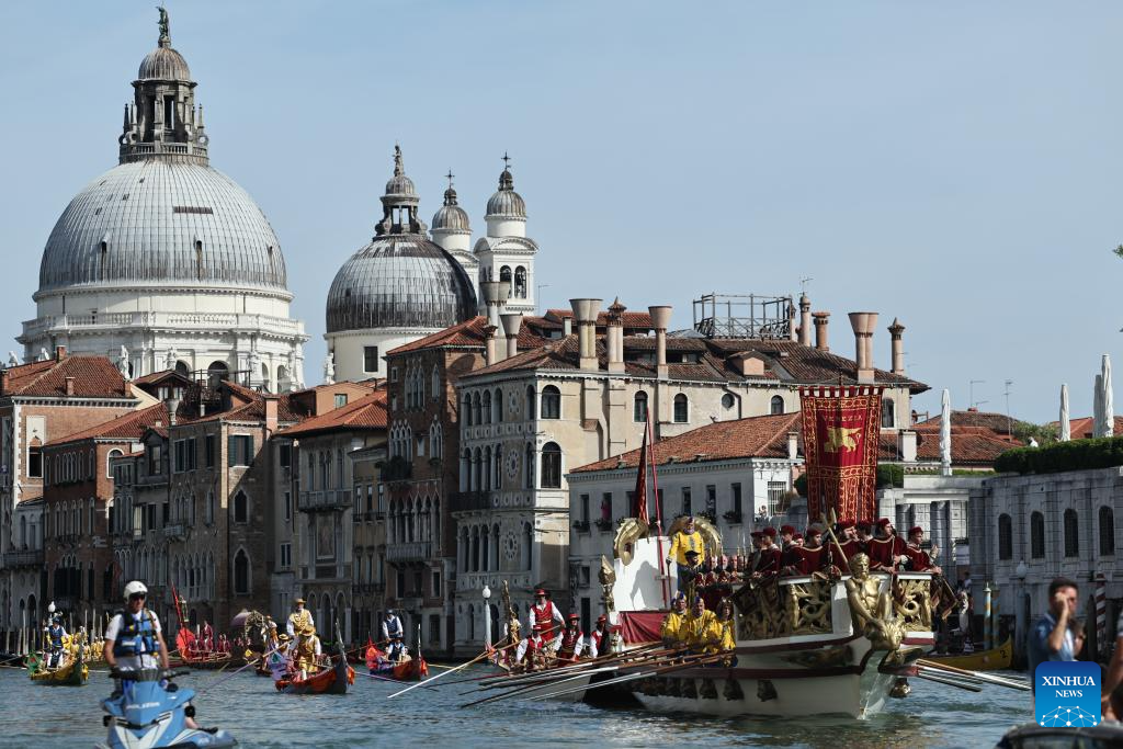 VENECIA, 8 septiembre, 2025 (Xinhua) -- Imagen del 7 de septiembre de 2025 de personas participando en la Regata Histórica, en Venecia, Italia. La Regata Histórica es un desfile anual de botes y una carrera de remo en el Gran Canal de Venecia. (Xinhua/Li Jing)
