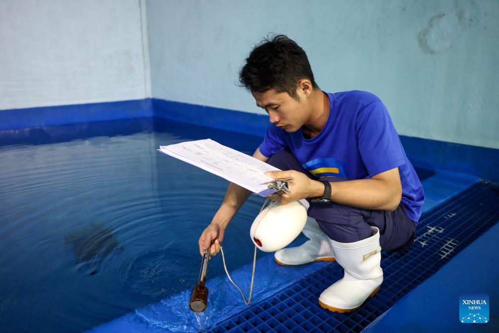LINGSHUI, 9 septiembre, 2025 (Xinhua) -- Imagen del 8 de septiembre de 2025 de un empleado midiendo la temperatura del agua en el Centro de Conservación y Rescate del Océano Azul, en Lingshui, en la provincia de Hainan, en el sur de China. Una foca llamada Anong, conocida por interactuar con los pescadores locales en una playa sin urbanizar del poblado de Dongjiao, en la ciudad de Wenchang, en la provincia de Hainan, fue trasladada a un centro de conservación de fauna acuática en Lingshui para su protección y su regreso a su hábitat en el futuro. (Xinhua/Zhang Liyun)