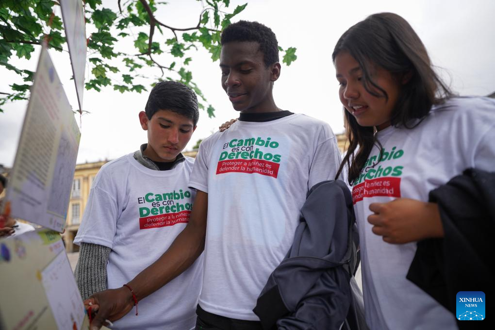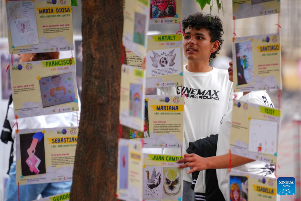 BOGOTA, 9 septiembre, 2025 (Xinhua) -- Niños observan una instalación artística durante un evento en el marco de la conmemoración del Día Nacional de los Derechos Humanos, en Bogotá, capital de Colombia, el 9 de septiembre de 2025. (Xinhua/Andrés Moreno)