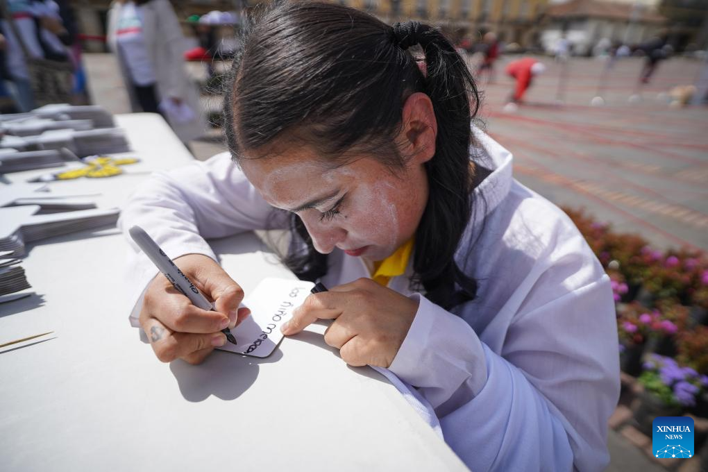 BOGOTA, 9 septiembre, 2025 (Xinhua) -- Una niña escribe un mensaje alusivo a la niñez durante un evento en el marco de la conmemoración del Día Nacional de los Derechos Humanos, en Bogotá, capital de Colombia, el 9 de septiembre de 2025. (Xinhua/Andrés Moreno)