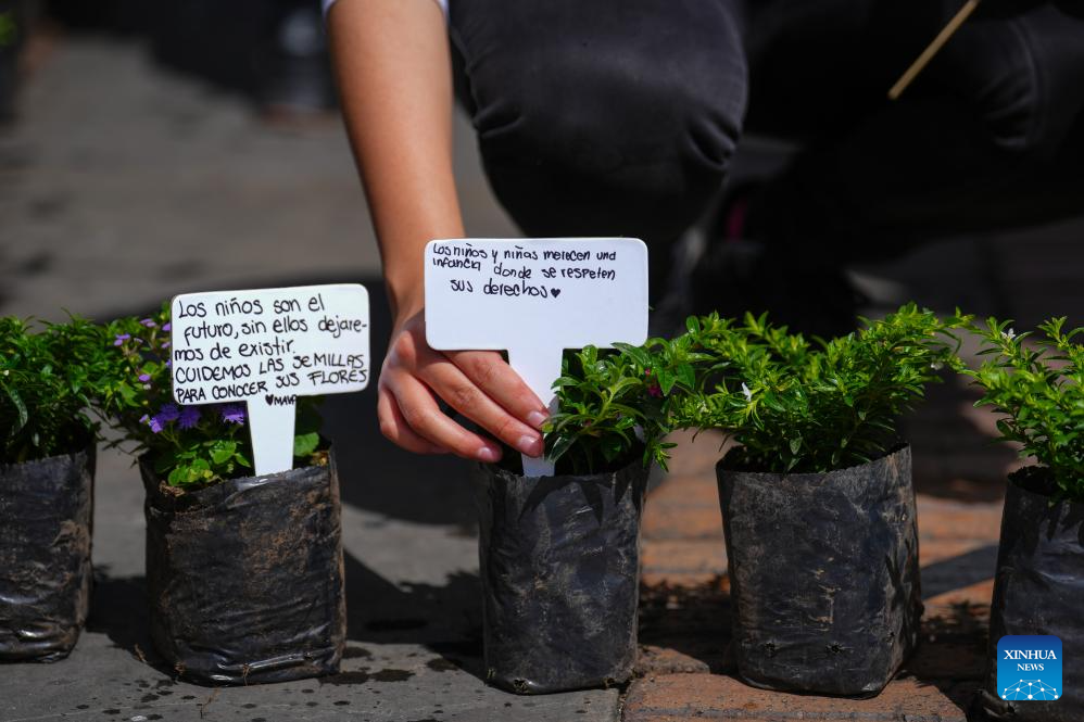 BOGOTA, 9 septiembre, 2025 (Xinhua) -- Una persona coloca un mensaje alusivo a la niñez junto a una planta durante un evento en el marco de la conmemoración del Día Nacional de los Derechos Humanos, en Bogotá, capital de Colombia, el 9 de septiembre de 2025. (Xinhua/Andrés Moreno)