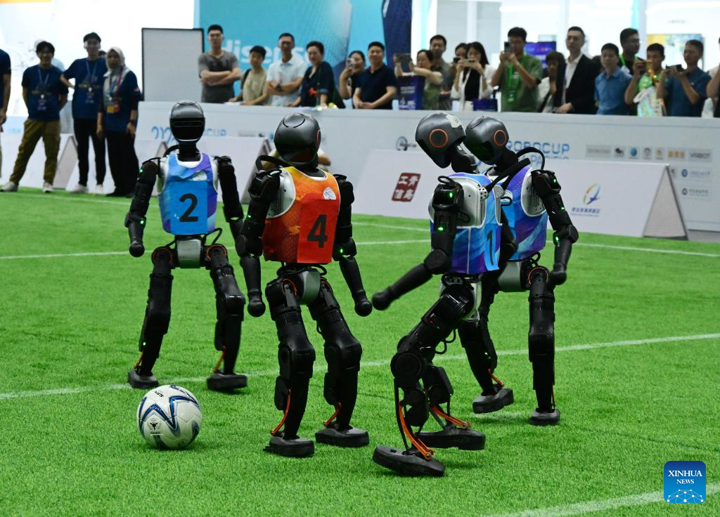 QINGDAO, 9 septiembre, 2025 (Xinhua) -- Imagen del 8 de septiembre de 2025 de robots compitiendo durante un partido de fútbol de la Copa Mundial de Robots (RoboCup) del Torneo Invitacional Asia-Pacífico de Qingdao, en Qingdao, en la provincia de Shandong, en el este de China. (Xinhua/Li Ziheng)