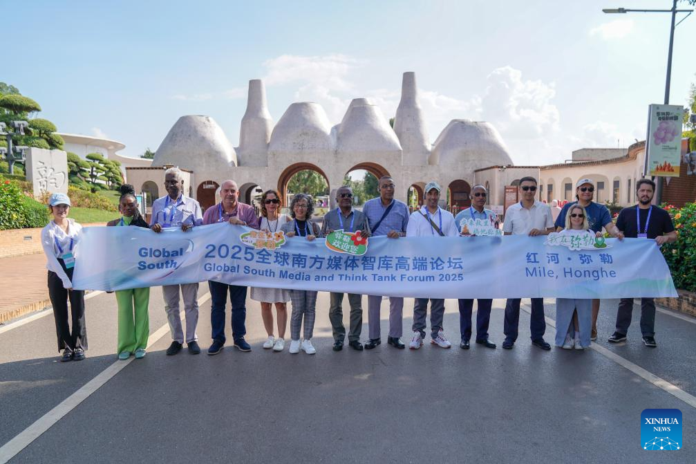KUNMING, 9 septiembre, 2025 (Xinhua) -- Imagen del 8 de septiembre de 2025 de invitados al Foro de Medios de Comunicación y Think Tanks del Sur Global 2025 posando para una fotografía grupal, en la ciudad de Mile de la prefectura autónoma hani y yi de Honghe, en la provincia de Yunnan, en el suroeste de China. Los invitados al foro, que comenzó el sábado en Kunming, capital de Yunnan, visitaron diferentes lugares de la provincia durante los dos días posteriores. (Xinhua/Peng Yikai)