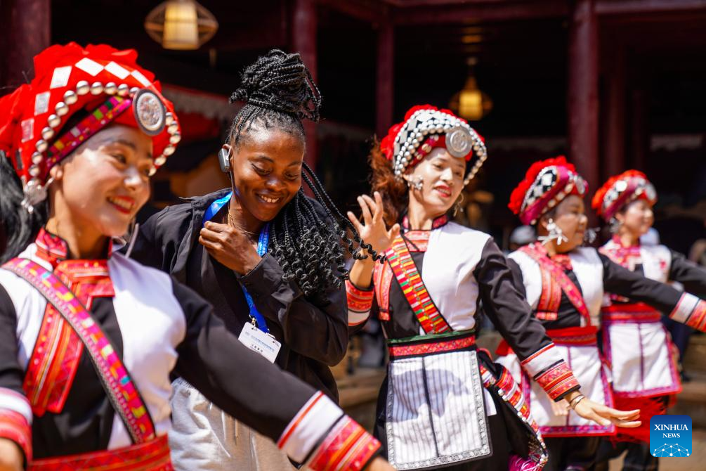 KUNMING, 9 septiembre, 2025 (Xinhua) -- Imagen del 8 de septiembre de 2025 de una invitada (2-i) al Foro de Medios de Comunicación y Think Tanks del Sur Global 2025 bailando con residentes, en la ciudad de Mile de la prefectura autónoma hani y yi de Honghe, en la provincia de Yunnan, en el suroeste de China. Los invitados al foro, que comenzó el sábado en Kunming, capital de Yunnan, visitaron diferentes lugares de la provincia durante los dos días posteriores. (Xinhua/Peng Yikai)