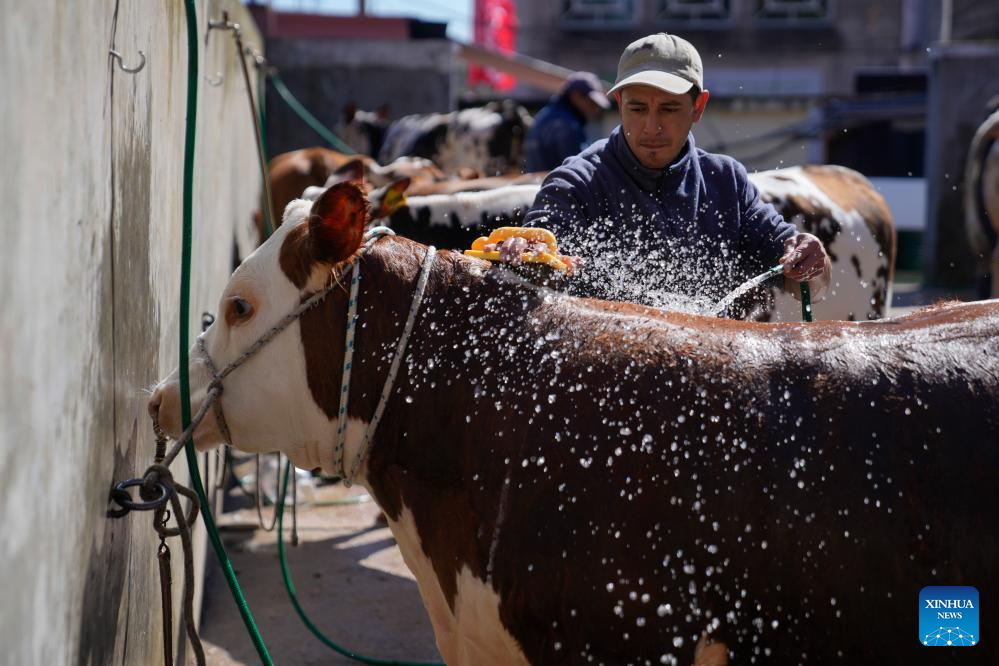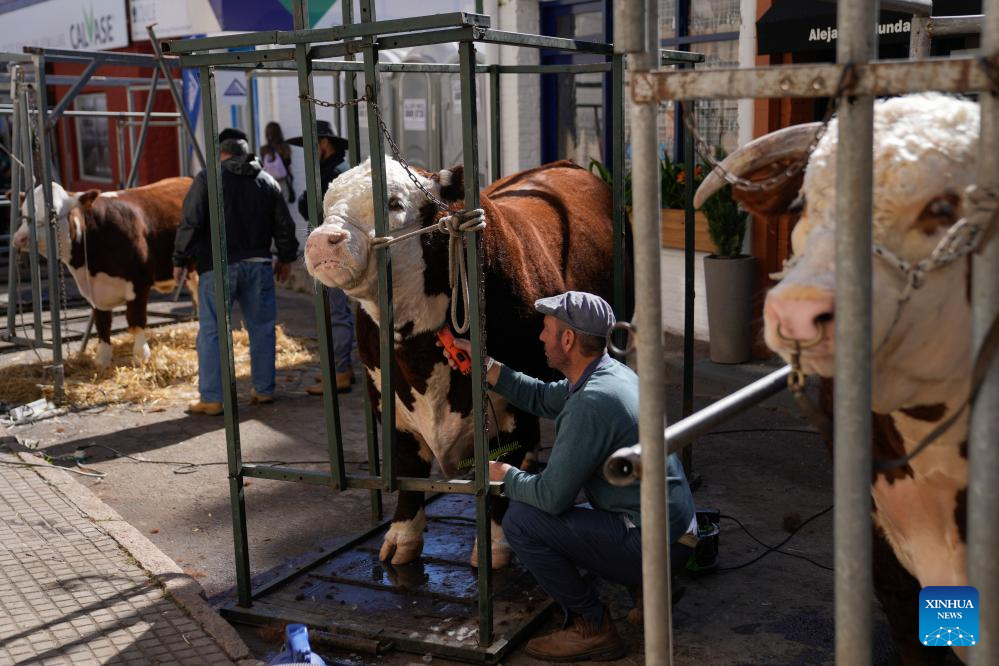 MONTEVIDEO, 9 septiembre, 2025 (Xinhua) -- Un hombre baña a un novillo durante la edición 120 de la Exposición Internacional de Ganadería y Muestra Internacional Agro Industrial y Comercial "Expo Prado", en Montevideo, capital de Uruguay, el 9 de septiembre de 2025. (Xinhua/Nicolás Celaya)
