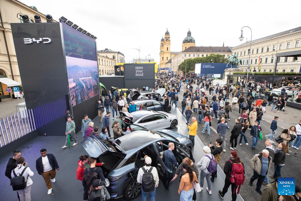 MUNICH, 10 septiembre, 2025 (Xinhua) -- Imagen del 9 de septiembre de 2025 de personas visitando la zona de exposición de BYD durante la IAA Mobility 2025, en Múnich, Alemania. La IAA Mobility 2025, una de las ferias de movilidad más grandes del mundo, comenzó aquí el martes, con fabricantes y proveedores de automóviles globales mostrando vehículos eléctricos, conducción autónoma e innovaciones impulsadas por software. (Xinhua/Zhang Fan)