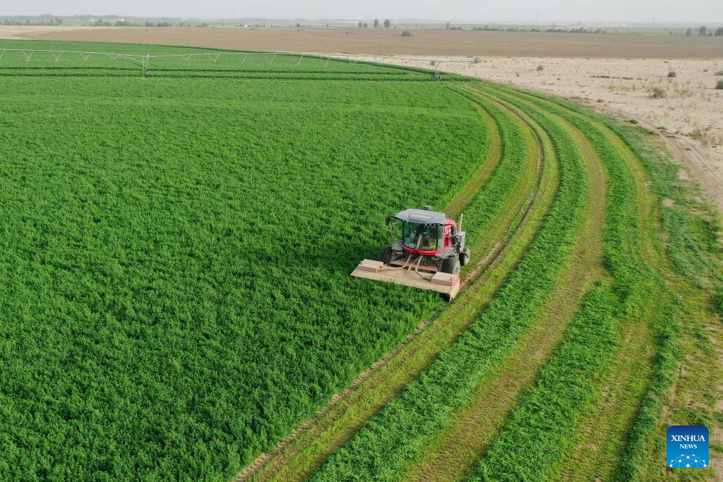 HOTAN, 11 septiembre, 2025 (Xinhua) -- Vista aérea tomada con un dron el 10 de septiembre de 2025 de un operador de maquinaria agrícola conduciendo una máquina para cosechar alfalfa en una base de demostración de plantación de alfalfa, en el distrito de Hotan de la prefectura de Hotan, en la región autónoma de la etnia uygur de Xinjiang, en el noroeste de China. La plantación de alfalfa ha proporcionado un suministro estable de forraje para la ganadería local.(Xinhua/Ding Lei)