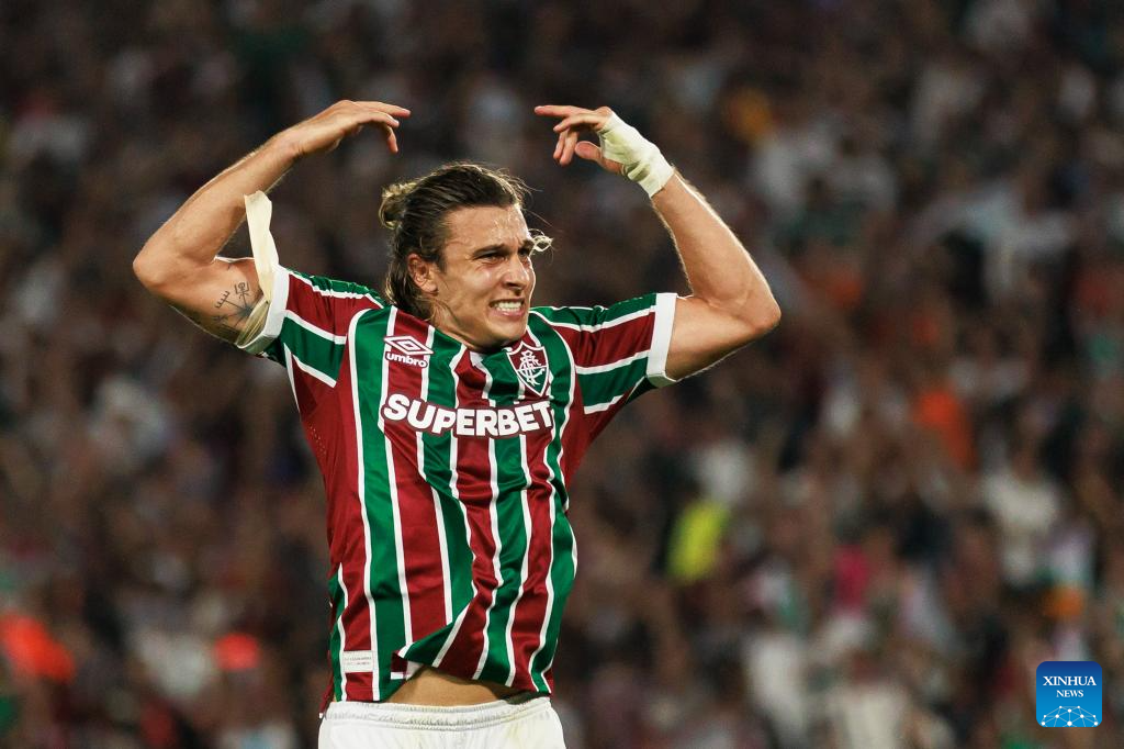 RIO DE JANEIRO, 11 septiembre, 2025 (Xinhua) -- Imagen del 10 de septiembre de 2025 del jugador, Canobbio, de Fluminense, festejando su anotación durante el partido de vuelta de los cuartos de final de la Copa de Brasil ante Bahía, celebrado en el Estadio Maracaná, en Río de Janeiro, Brasil. (Xinhua/Claudia Martini)