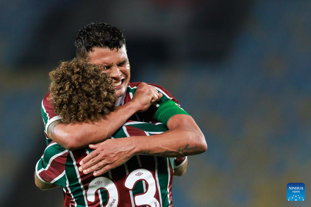 RIO DE JANEIRO, 11 septiembre, 2025 (Xinhua) -- Imagen del 10 de septiembre de 2025 del jugador, Thiago Silva (atrás), de Fluminense, festejando su anotación junto a su compañero, Guga (frente), durante el partido de vuelta de los cuartos de final de la Copa de Brasil ante Bahía, celebrado en el Estadio Maracaná, en Río de Janeiro, Brasil. (Xinhua/Claudia Martini)
