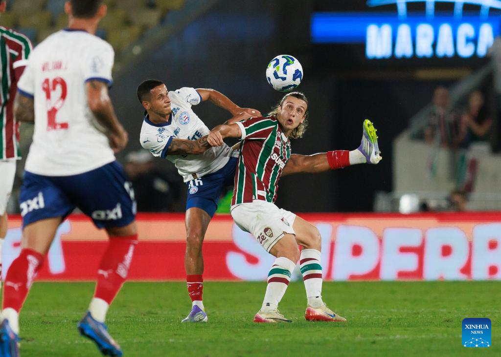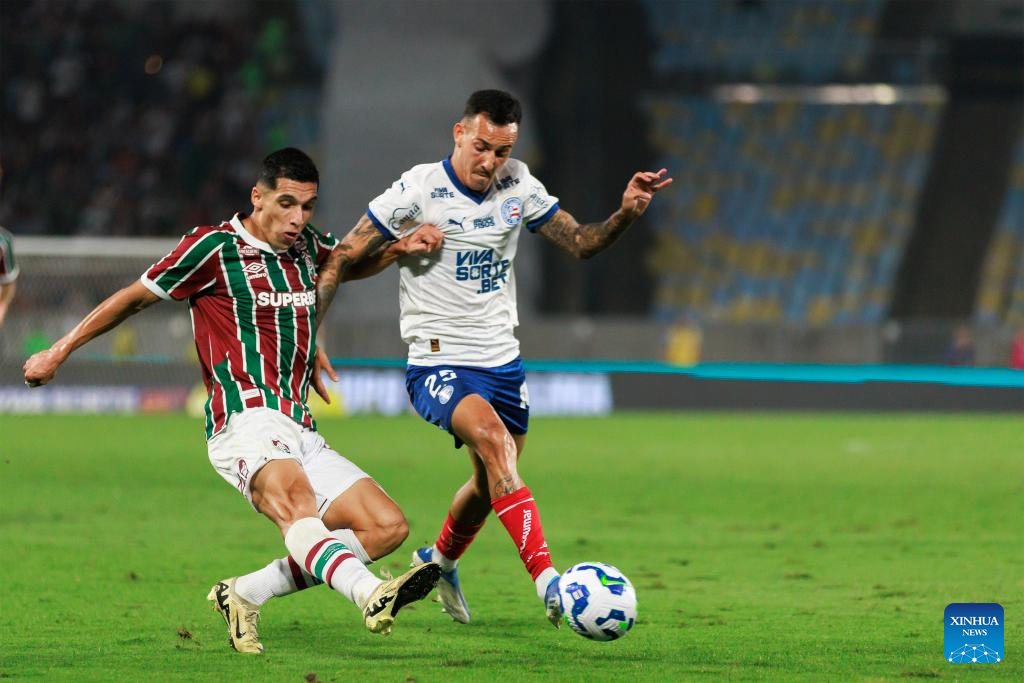 RIO DE JANEIRO, 11 septiembre, 2025 (Xinhua) -- Imagen del 10 de septiembre de 2025 del jugador, Canobbio (d), de Fluminense, disputando el balón con el jugador, Luciano Juba (c), de Bahía, durante el partido de vuelta de los cuartos de final de la Copa de Brasil, celebrado en el Estadio Maracaná, en Río de Janeiro, Brasil. (Xinhua/Claudia Martini)