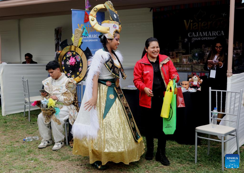 Una mujer porta un traje tradicional mientras participa en la VIII Feria Internacional de Turismo "Fiavit 2025", en Lima, Perú, el 11 de septiembre de 2025. La "Fiavit 2025" se desarrolla del 11 al 12 de septiembre en la capital de Perú con una amplia oferta turística nacional e internacional, en los jardines del Museo de Arte Contemporáneo de Lima, en el distrito capitalino de Barranco. (Xinhua/Mariana Bazo)