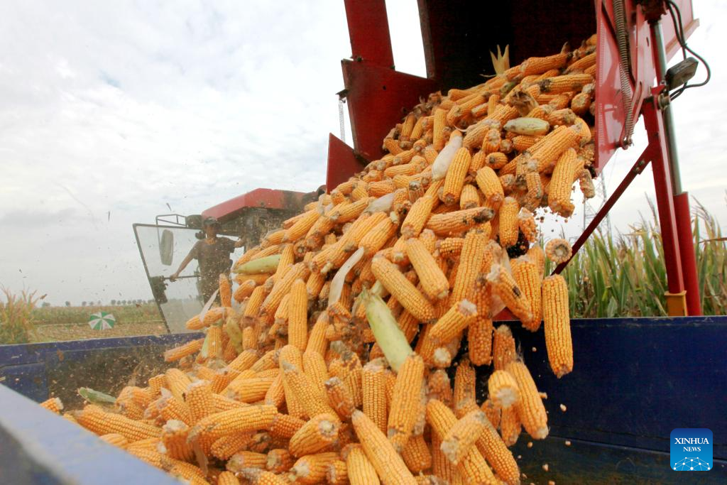 BEIJING, 11 septiembre, 2025 (Xinhua) -- Aldeanos cargan maíces cosechados a un camión, en el poblado de Baotai del distrito de Pingyi, en la ciudad de Linyi, en la provincia de Shandong, en el norte de China, el 11 de septiembre de 2025. (Xinhua/Wu Jiquan)