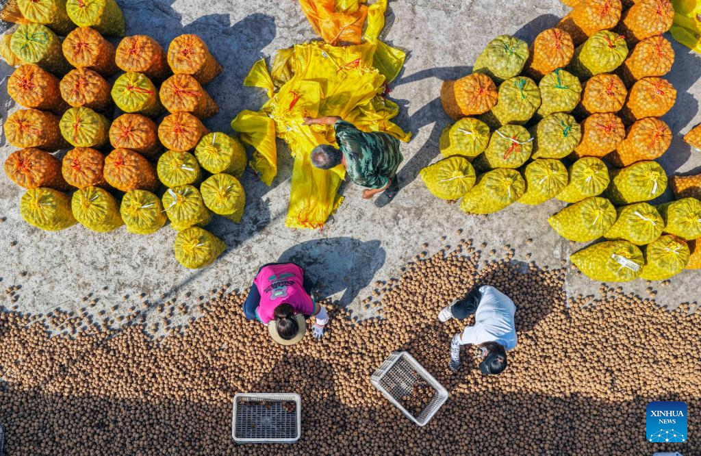 BEIJING, 11 septiembre, 2025 (Xinhua) -- Vista aérea tomada con un dron el 8 de septiembre de 2025 de aldeanos aireando nueces en un patio, en la ciudad de Zunhua, en la provincia de Hebei, en el norte de China. (Xinhua/Liu Mancang)